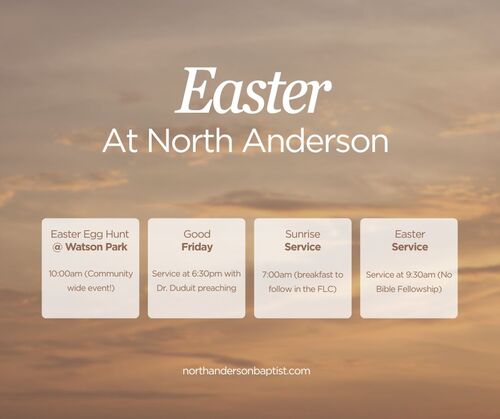 I hope that your week has gotten off to a great start! I'm still praising the Lord for the wonderful morning of Bible Fellowship and worship that we we're blessed to share in on Sunday at North Anderson and the many guest that joined us in worship of our King. I'm sure that you encouraged by the vibrant singing and were challenged and edified, as was I, by the preaching of God's Word. It's always so special to partake in the Lord's Supper as a family of believers, as well.