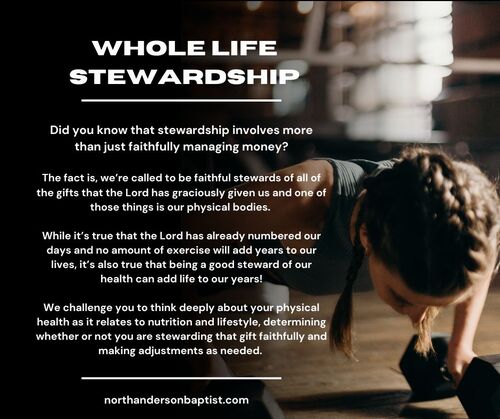 Whole Life Stewardship Challenge – This week, we challenge you to be intentional in getting a minimum of 30 minutes of exercise in each day. This could mean going to the gym or for a jog, and many members of our church family get their exercise that way, but please don’t limit the term “exercise” to those two things.