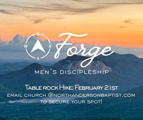 There are three needs that every Christian man has: Adventure, Adversity, and Accountability. This year at North Anderson, Pastor Kyle will be leading a discipleship intensive designed to work those three things into the rhythm of life through activities and Bible studies that stretch us spiritual and physically. This ministry is called “Forge” and due to the nature of what we’ll be engaging in, space is limited. Register ASAP by emailing church@northandersonbaptist.com